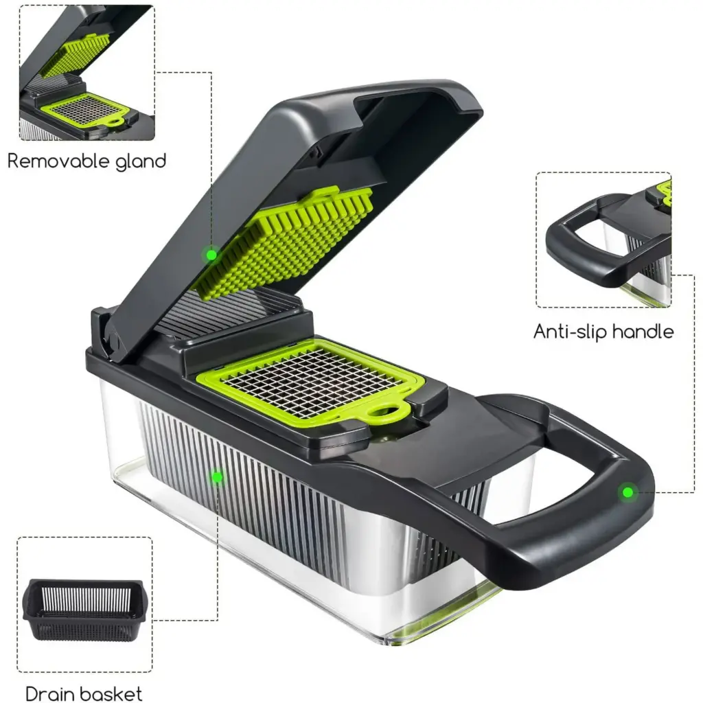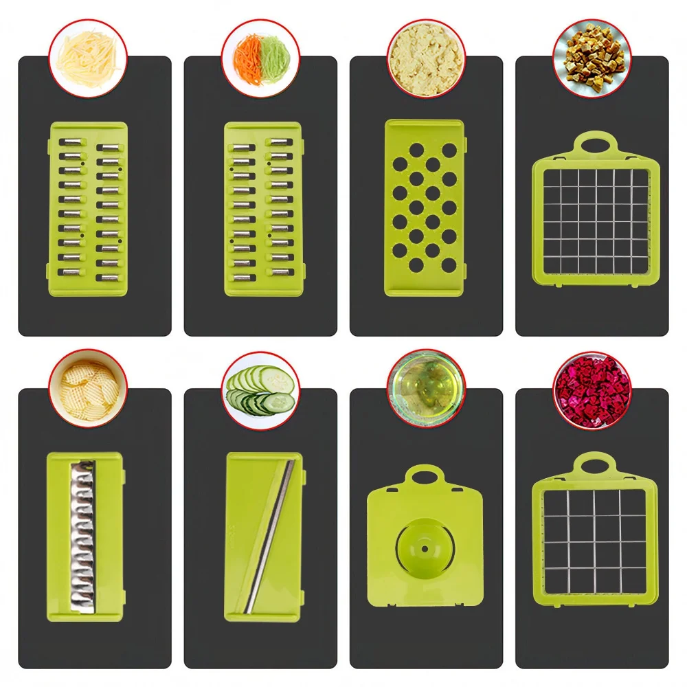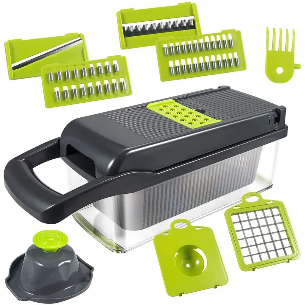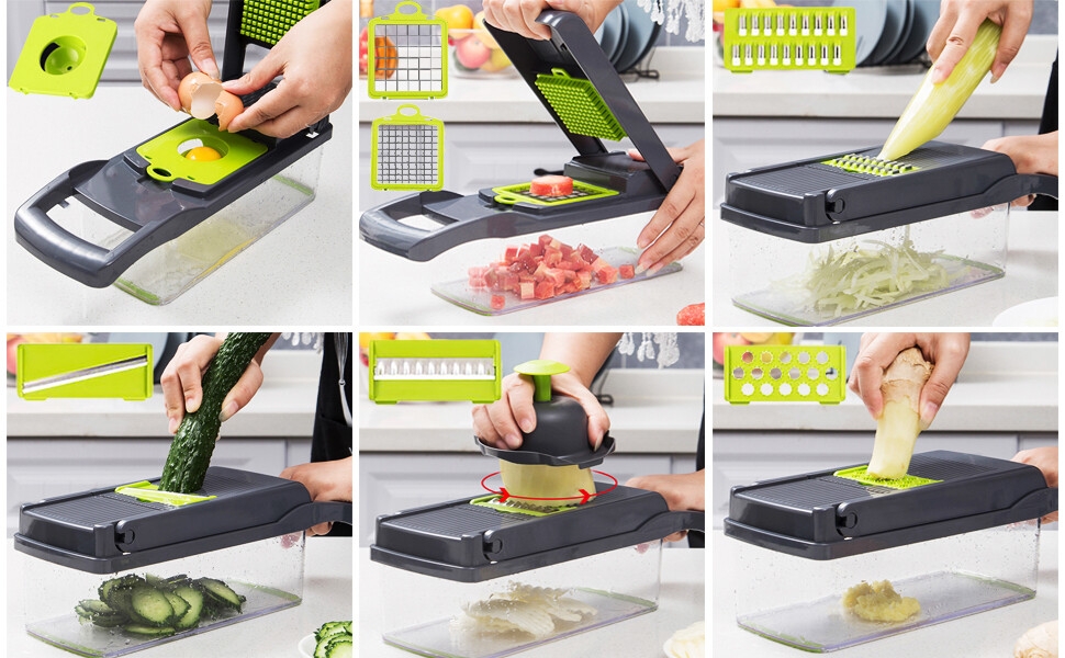 Forget about juggling a circus of gadgets; we’re offering you EIGHT blades in one sleek package. Cucumbers, potatoes, cheeses, fruits – you name it, we slice it! We’re talking about dicing, grating, slicing, and making your kitchen shenanigans a walk in the park.